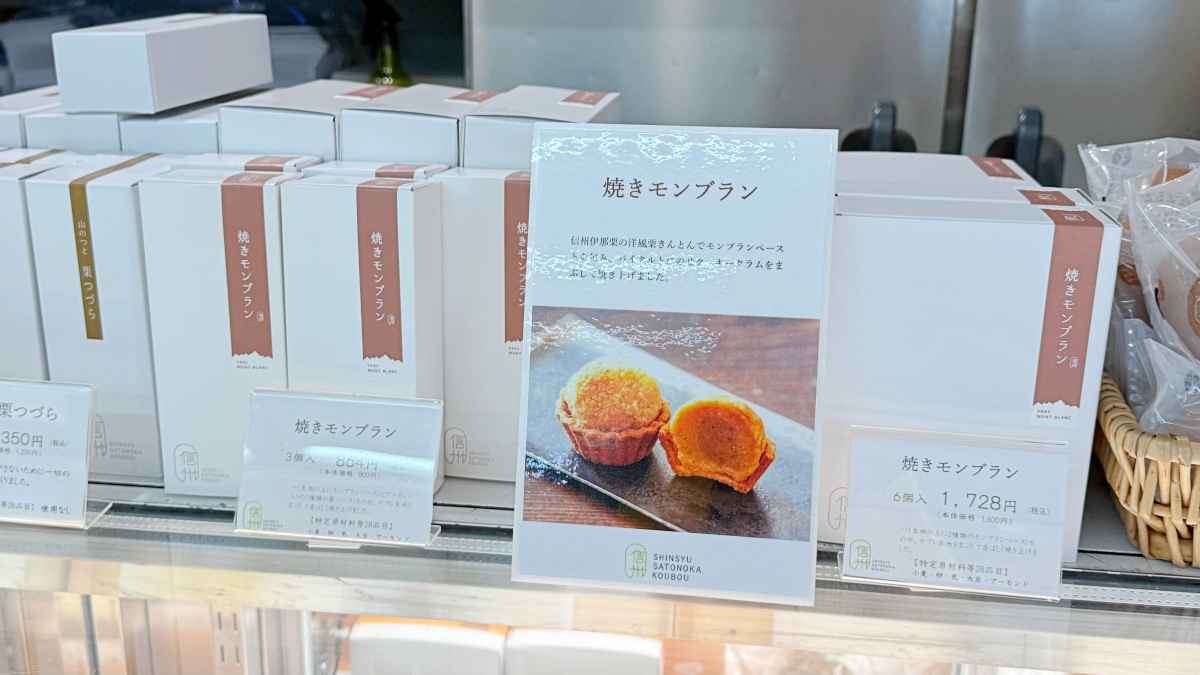 持ち歩きもしやすそうな「焼きモンブラン」3個入り864円、6個入り1,728円。
