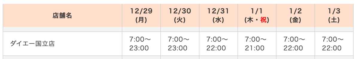 『ダイエー 国立店』年末年始の営業時間
