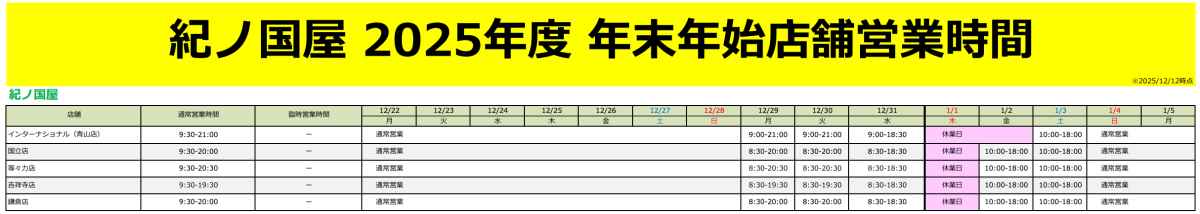 『紀伊国屋 国立店』年末年始の営業時間