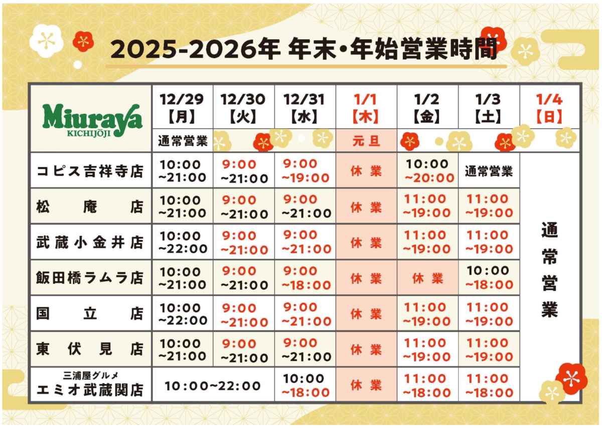 『三浦屋 国立店』年末年始の営業時間