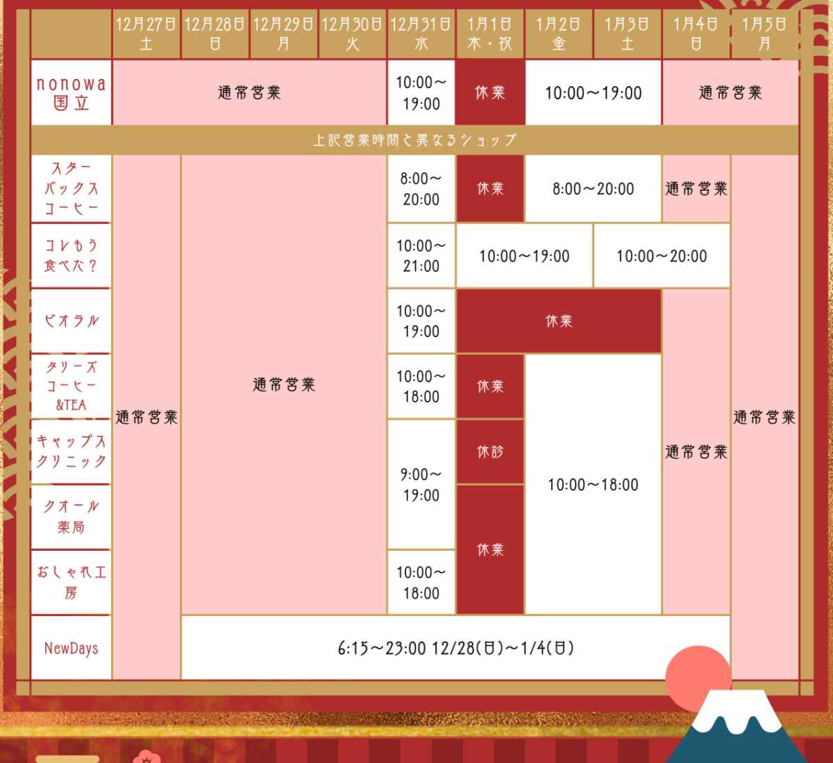 『nonowa国立』年末年始の営業時間