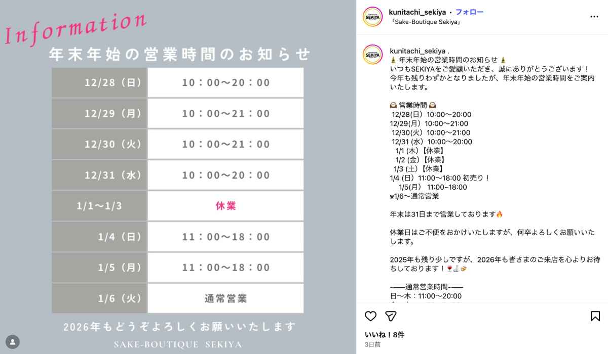 西友と同じ「国立せきやビル」に入る酒屋の『せきや』は、年末年始特別営業時間となるのでご注意ください。