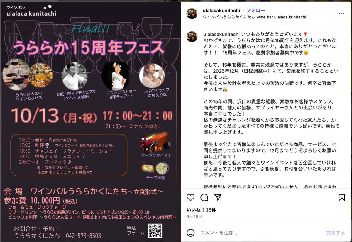 国分寺市光町にあるワインバル『うららかくにたち』が、2025年12月をもって閉店することが決まったようです。