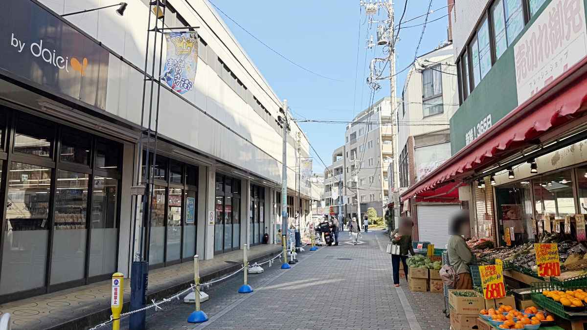 『フレッシュショップシマノ』なども並ぶ、谷保のにぎやかなエリアです。