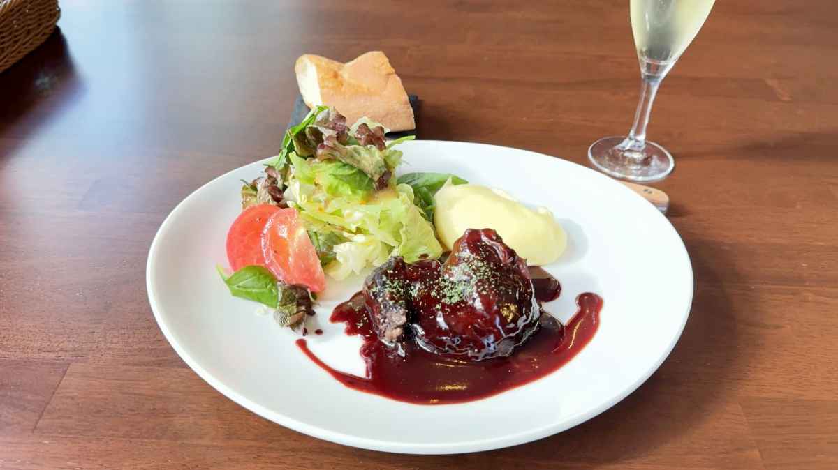 「牛ホホの赤ワイン煮込み(サラダ・マッシュポテト・パンorライス付き)」1,800円 と、「樽生スパークリングワイン(白)」700円。