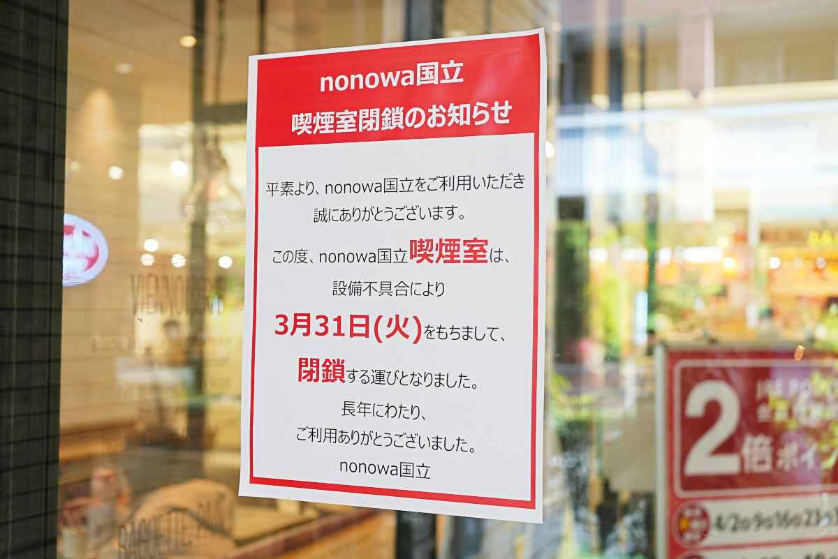 《閉店》国立駅唯一の喫煙所が!nonowa国立の喫煙室が3/31(火)に閉鎖してる 2026 4/10 開店・閉店 nonowa国立 メディア連携 国立駅 閉店 2026年4月10日 あまみ URLをコピーする URLをコピーしました! 愛煙家の方には残念なお知らせかもしれません。 nonowa国立にあった喫煙室が2026年3月31日(火)をもって閉鎖しています。 設備の不具合が閉鎖の理由みたい。 街中や、飲食店なども、喫煙可の場所が減っている昨今。 設備を維持するのも、いろいろ大変なのかもしれません。 場所はここ↓ 寄ってみる↓ nonowa国立の西側、『マツモトキヨシ nonowa国立店』のちかくにありました。 開店・閉店 nonowa国立 メディア連携 国立駅 閉店 この記事が気に入ったら いいね または フォローしてね! Follow @iinekunitachi Follow Me シェアして話のネタにしよう URLをコピーする URLをコピーしました! 《閉店》nonowa国立にあったフィンランド発のドーナツ店『アーノルド(arnolds)nonowa国立店』が閉店してる。 関連記事 《閉店》旭通りぞいにあった居酒屋『遊泳禁止2』が閉店してる 2026年3月28日 コレ食べ初出店!11/26(水)〜12/9(火)のnonowa国立『コレもう食べた?』は福井名物・焼き鯖すしの『若廣(わかひろ)』が出店中 2025年11月29日 かなり不便かも……『nonowa国立WEST』の連絡通路が一時的に通れなくなるみたい 2022年7月19日 あえて食べてみる、『ロージナ茶房』の「ポモドーロ」【国立グルメ】 2022年12月17日 サンタさんがやってくる!12/20(土)は国立駅南口・大学通りでクリスマスイベント開催。ミニコンサートやサンタさんと記念撮影も 2025年12月19日 刺身が超盛り盛り盛り!!定食屋『とりいづか』の「刺身盛り合わせ定食」【国立グルメ】 2018年11月9日 今年も会えたね!国立駅でツバメが巣作り始めそうな気配 2025年4月12日 学生経営のカフェ!富士見台・むっさ21内にある『カフェ ここたの』で「ブレンドコーヒー」と「オレンジガトーショコラ」を味わってみた 2023年12月25日