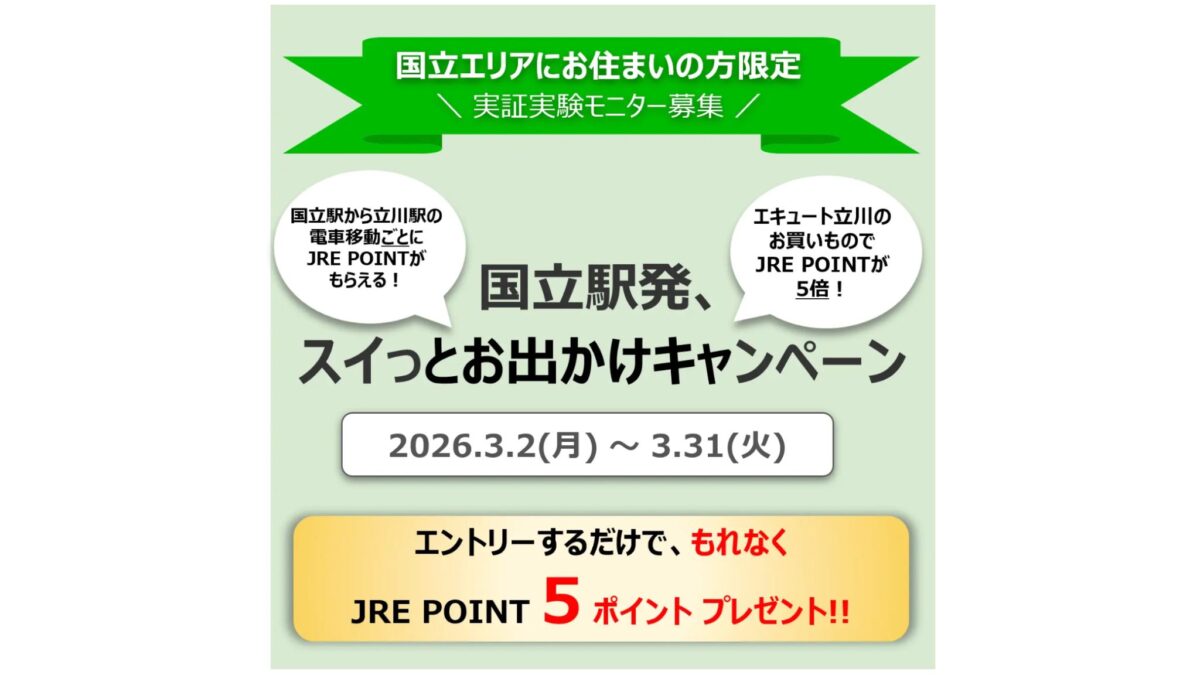 対象区間【国立駅(入場)→立川駅出場)】を利用ごとに、73ポイント〜最大146ポイントが付与。