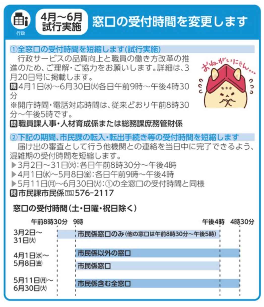 ちなみに他の窓口も、試行実施として4月1日(水)〜6月30日(火)の期間、受付時間が9:00〜16:30に短縮。