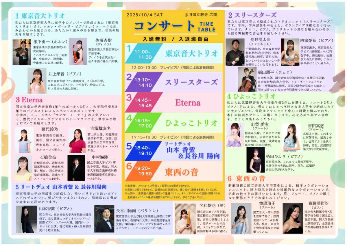 国立音大・東京音大・武蔵野音大などの現役学生や、プロとして活躍するOBOGたちの生演奏を楽しむことができるみたい。