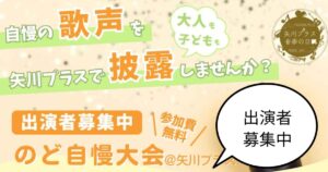 美声自慢あつまれ〜!6/27(土)に開催される「矢川プラス音楽の日〜のど自慢大会〜」の出演者を募集しているみたい。応募締め切りは4/30(木)。 2026 4/10 注目のイベント メディア連携 矢川 矢川駅 2026年4月10日 あまみ URLをコピーする URLをコピーしました! 昨年2025年に2年ぶりに『矢川プラス』で開催された、「矢川プラス音楽の日〜のど自慢大会〜」。 前回開催時の記事はこちら↓ いいね!国立 2年ぶりに帰ってきた!7/12(土)『矢川プラス』で「矢川プラス音楽の日〜のど自慢大会〜」が開催されるみた… 7/12(土)『矢川プラス』で「矢川プラス音楽の日〜のど自慢大会〜」が開催されます。観覧は自由&無料で誰でもウェルカム! 2026年も6月27日(土)に開催が決定! それに伴い、出演者を募集しているみたい。 こちら↓ 『矢川プラス』公式サイトより引用 出演申し込みの締切は、4月30日(木)〆。 応募多数の場合は、演目や年齢構成等を踏まえて選考・抽選になるようです。 我こそは!という方は、応募してみてはいかがでしょうか。 注目のイベント メディア連携 矢川 矢川駅 この記事が気に入ったら いいね または フォローしてね! Follow @iinekunitachi Follow Me シェアして話のネタにしよう URLをコピーする URLをコピーしました! 【週末駅前イベント情報】4月11日(土)・12日(日)は、旧国立駅舎で「青春フォークソングLive Vol.3-」と「平和の歌を 皆さんに (三多摩青年合唱団)」が開催されるみたい。 関連記事 アップルパイ専門店!10/29(水)〜11/11(火)のnonowa国立『コレもう食べた?』は『グラニースミス(GRANNY SMITH)』が出店中 2025年10月31日 《休業》しばらくお休みです。谷保駅すぐの『モスバーガー 谷保駅前店』が店舗改装のため3月11日(水)まで休業中 2026年2月28日 ゴージャス蟹づくし!6/11〜6/24の『コレもう食べた?』は、カニと海鮮のお弁当・お惣菜の『カニの匠 クラクラ』が営業中 2025年6月14日 《閉店》国立駅北口にあるカフェ『Organic Garden North(オーガニックガーデンノース)』が2月20日に閉店するみたい 2024年2月8日 《閉店》富士見通り沿いにあるレストラン『台形』が国立での営業を終了してる 2024年10月2日 《閉店》そのまま閉店へ……。旭通りのラーメン屋『中華そばムタヒロ 国立店』が閉店してる 2023年7月12日 いろいろあって悩んじゃう!9/3〜9/16のnonowa国立『コレもう食べた?』はどら焼き専門店『志ち乃』が出店中 2025年9月5日 【開店】モーニングからディナーまで!谷保第一公園そばに『カフェ9(きゅう)』が7月25日(金)にオープンするみたい。 2025年7月25日